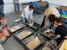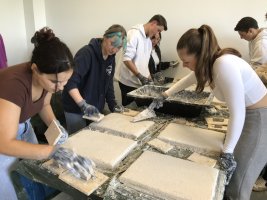 Pour travailler dans les mêmes conditions qu’à la Renaissance, les élèves ont d’abord fait des « cartons », c’est-à-dire des dessins préparatoires, et se sont entraînés à utiliser les pigments et la caséine (qui fait le liant). Ils ont ensuite réalisé un gabarit avec un papier calque percé de petits trous. Le travail du support a été très physique et s’est apparenté à de la maçonnerie ! Nous avons fait du mortier, nous avons taloché et enduit les supports avant d’y appliquer les pigments.