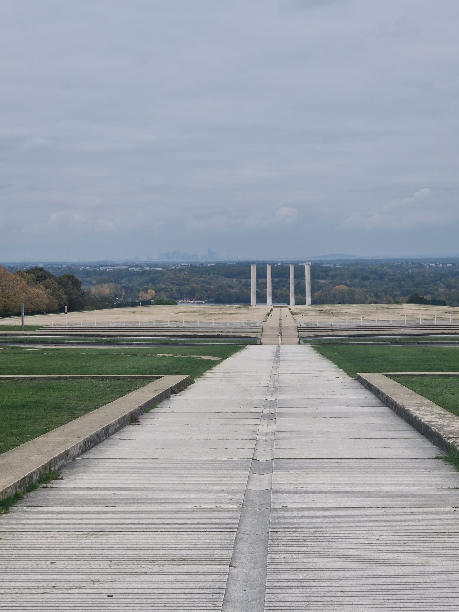 Depuis le verger, nous apercevons trois colonnes. En nous approchant, nous remarquons qu’il y en a en réalité douze, toutes alignées parfaitement de manière à tromper le visiteur. La vue panoramique nous permet d’admirer un vaste panorama sur Paris mais aussi la suite de l’Axe Majeur, qui descend désormais la colline. La perspective s’élargit désormais et s’ouvre sur la capitale.