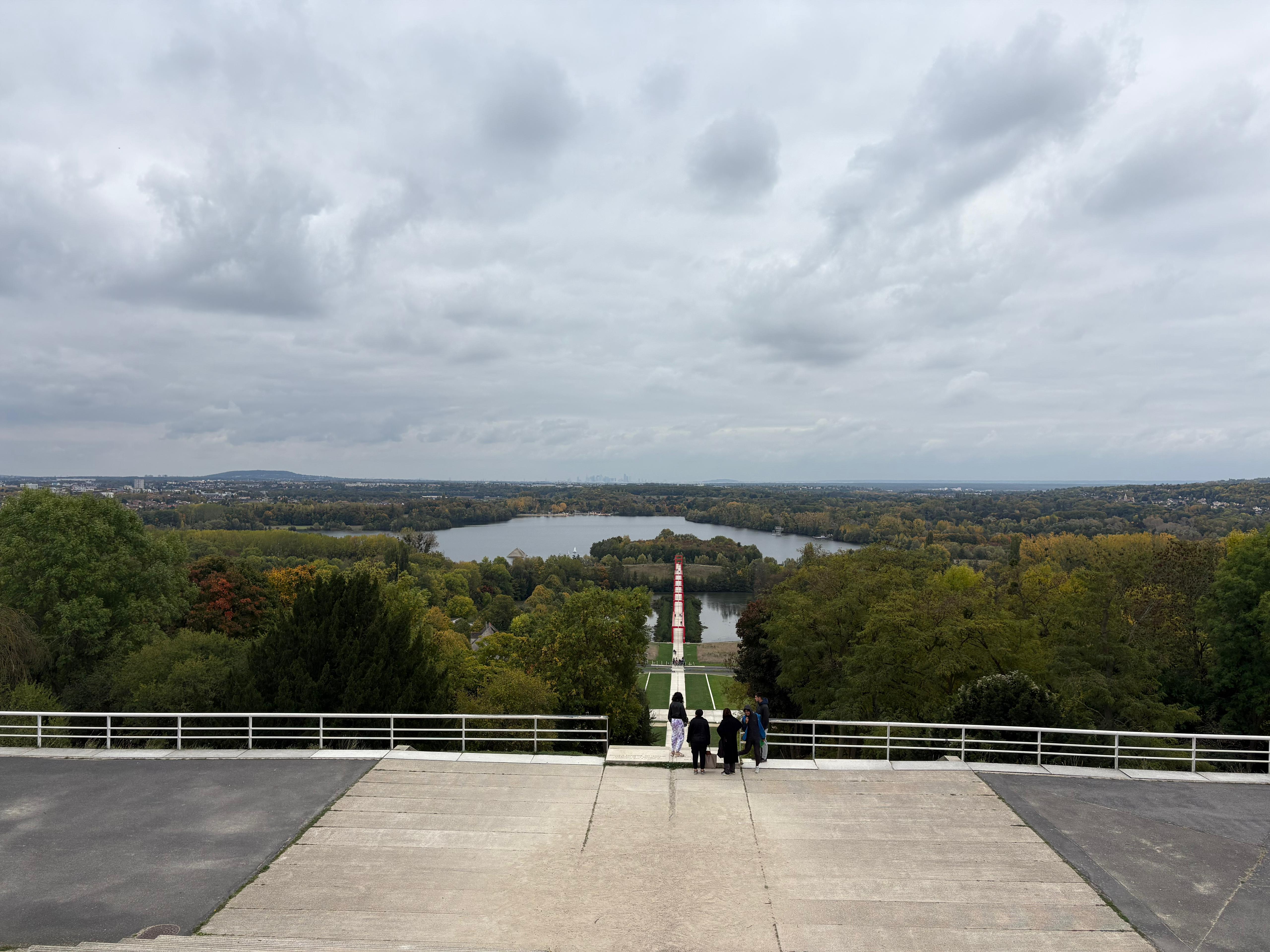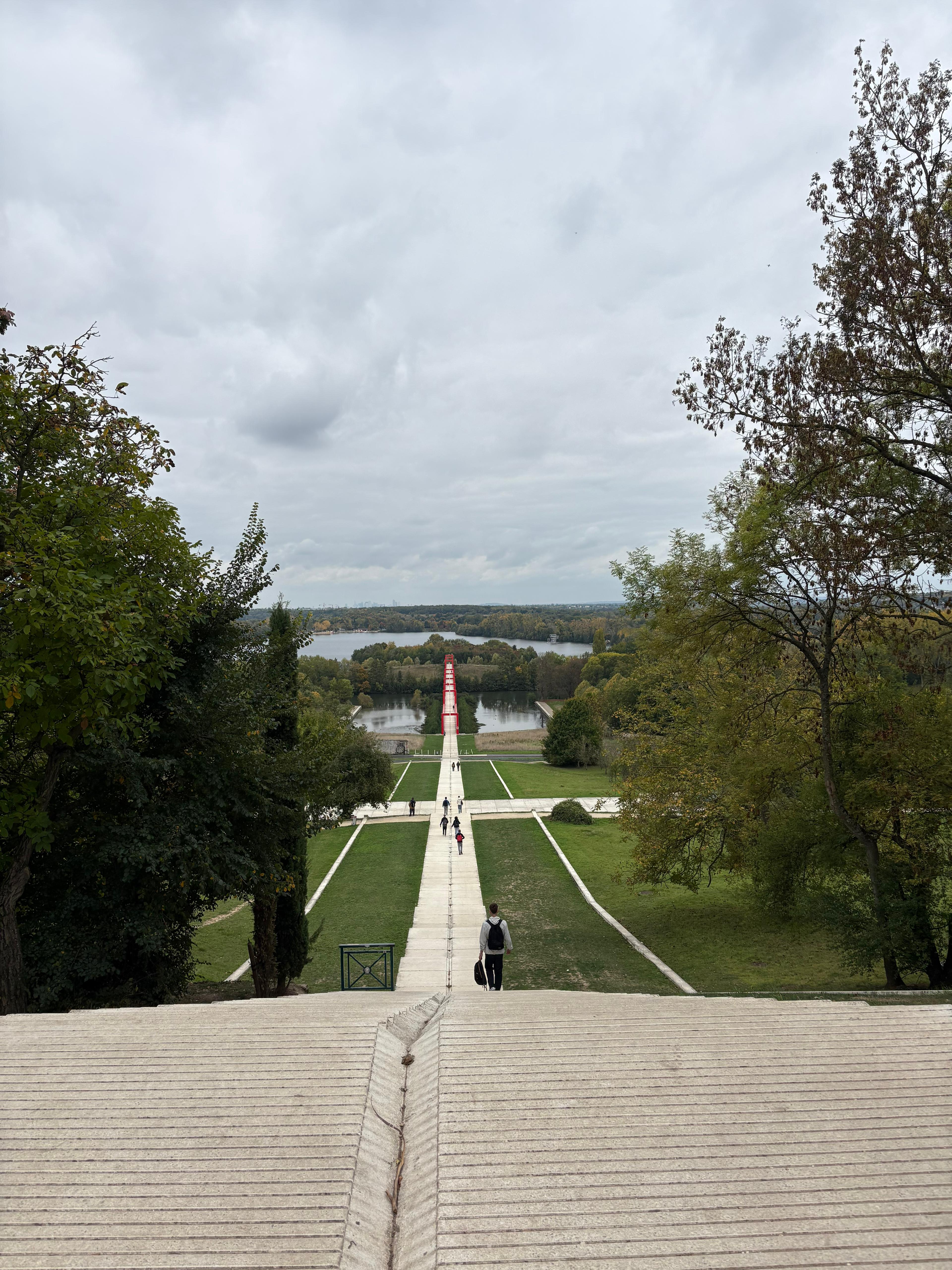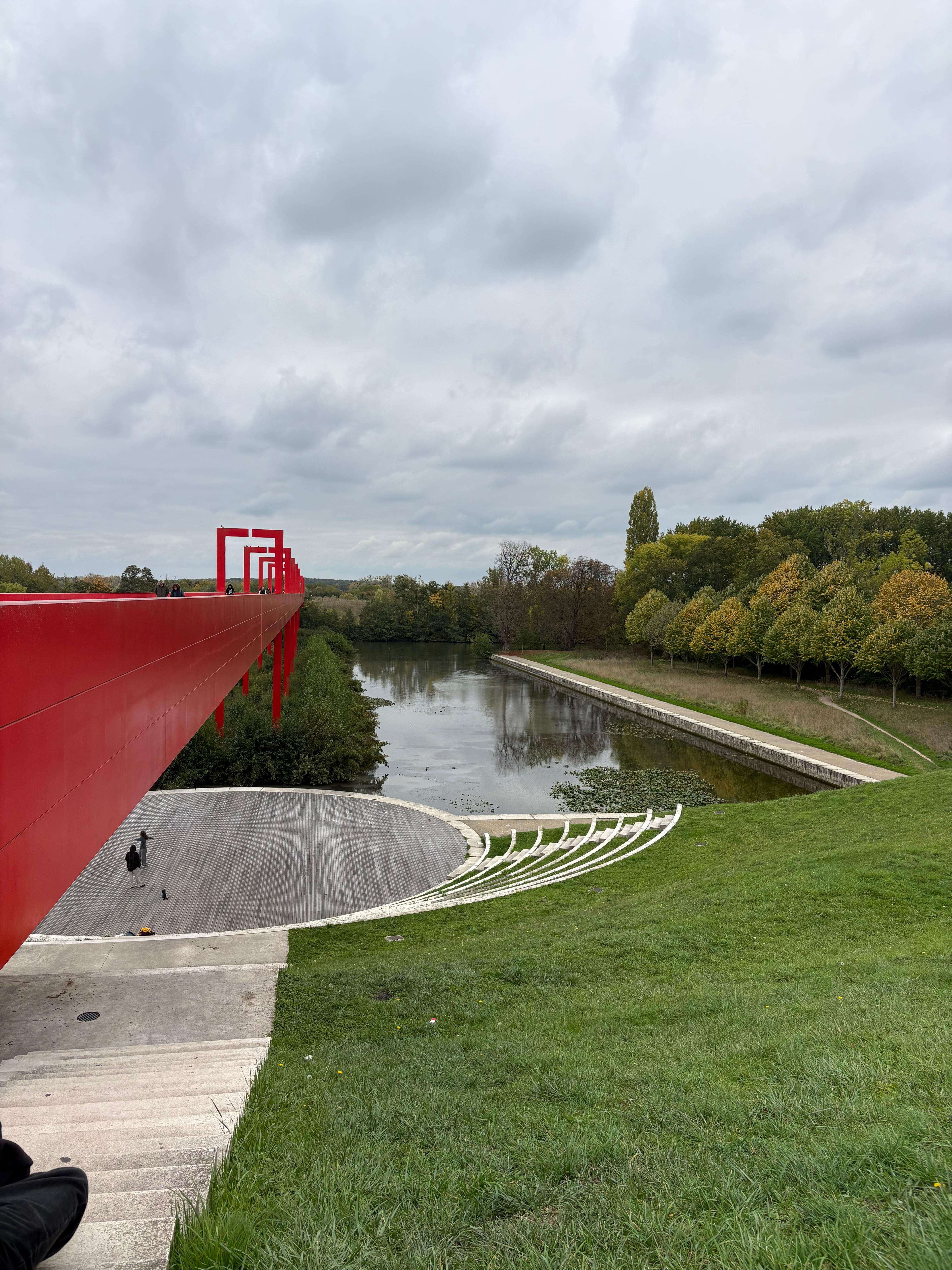 Puis nous finissons par aborder le dernier aspect de l’œuvre, son inachèvement. Selon les plans originaux, le pont rouge aurait dû se prolonger en traversant une petite île, réserve naturelle pour les oiseaux. Mais ce n’est pas le cas, et c’est au bord des étangs que s’achève la promenade de l’Axe Majeur.